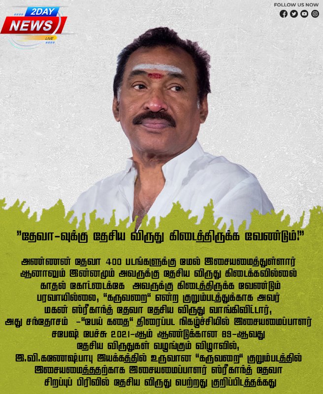 பரவாயில்லை, ‘கருவறை’ என்ற குறும்படத்துக்காக அவர் மகன் ஸ்ரீகாந்த் தேவா தேசிய விருது வாங்கிவிட்டார், அது சந்தோசம் -‘பேய் கதை’ திரைப்பட நிகழ்ச்சியில் இசையமைப்பாளர் சபேஷ் பேச்சு 2021-ஆம் ஆண்டுக்கான 69-ஆவது தேசிய விருதுகள் வழங்கும் விழாவில், இ.வி.கணேஷ்பாபு இயக்கத்தில் உருவான ‘கருவறை’ குறும்படத்தில் இசையமைத்ததற்காக இசையமைப்பாளர் ஸ்ரீகாந்த் தேவா சிறப்புப் பிரிவில் தேசிய விருது பெற்றது குறிப்பிடத்தக்கது
